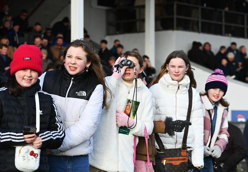 Gowran Park racegoers on Thyestes Day with Nancy Lyons Teahon watching through binoculars with friends Willow Henderson, Makela Fitzpatrick, Robyn Lyons Teahon and Grainne Cahill \ Healy Racing