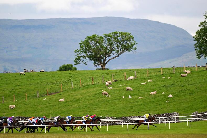 Ballinrobe scene with The Partry Mountain, cattle and sheep grazing in the field alongside the racetrack as runners and riders race past in race won by Net Boy \ Healy Racing