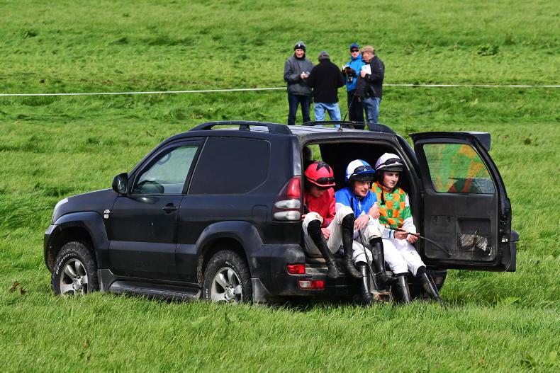 At Ballyknock, Frankie Murphy, Pa King and Shane Cotter take a lift back to base after parting company with their mounts \ Healy Racing