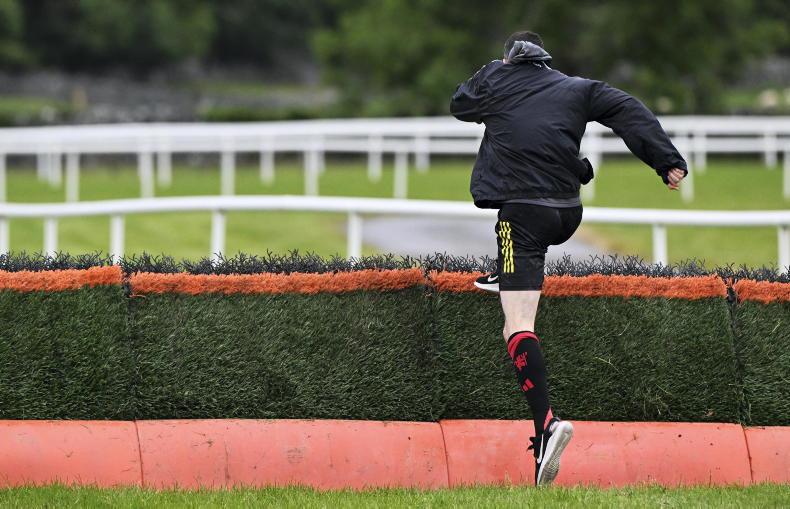 Constitution Hill. are you watching? Patrick Mullins measure the hurdle perfectly as he clears it on his jog around the track at Ballinrobe \ Healy Racing