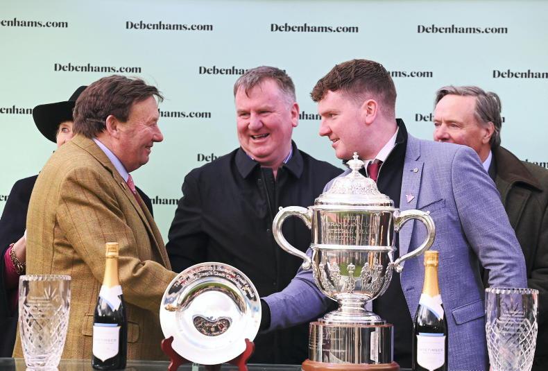 At Cheltenham, trainer Cian Collins with dad Alan behind and Nicky Henderson after Jazzy Matty won the Johnny Henderson Grand Annual Challenge Cup \ Healy Racing