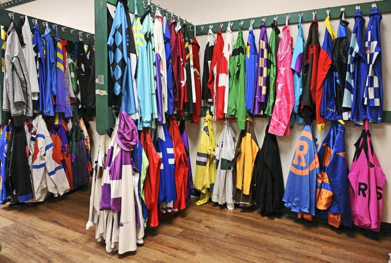 Del Mar, October, the Jockeys Room ahead of the Breeders' Cup meeting with owners silks and colours \ Healy Racing
