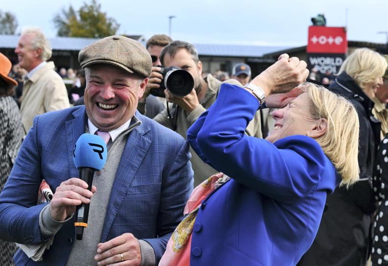 Eve Johnson Houghton reacts live on Racing TV with Kevin O'Ryan as Zavateri is announced the winner after a stewards enquiry at the Curragh on Irish Champions Weekend \ Healy Racing