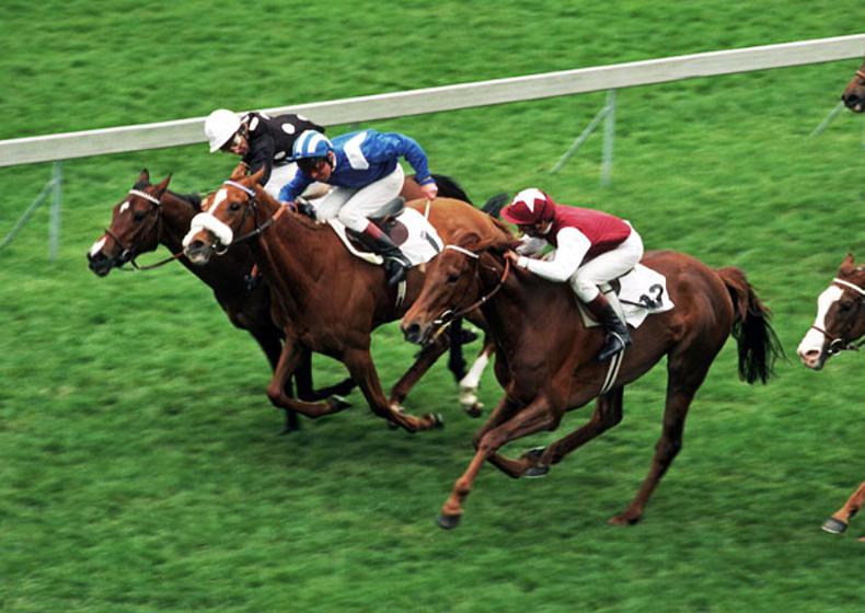 Oh So Sharp (Steve Cauthen, nearside) gets up to beat Al Bahathri (centre) and Bella Colora (rails) in the 1985 1000 Guineas