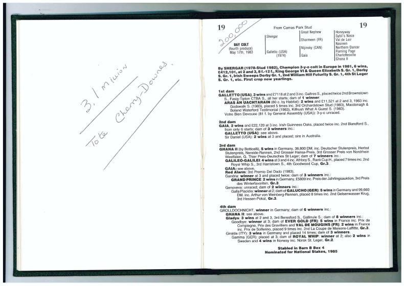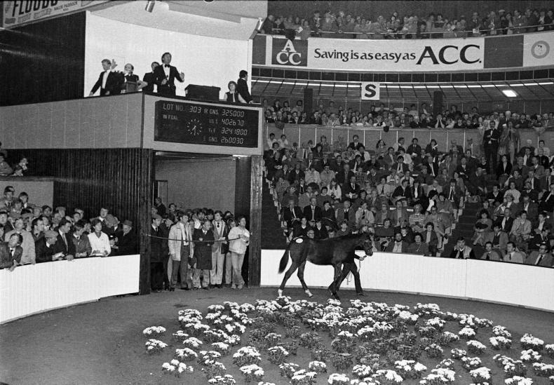 Bred by Robert Sangster’s Swettenham Stud and partners in Kentucky, the only progeny of the brilliant Shergar sold as a foal in 1977. Authaal came up from Tommy Stack’s Thomastown Castle Stud and was bought by the BBA’s Joss Collins on behalf of a group of Americans. Collins outbid Philip Myerscough and Bobby Barry for the colt whose dam Galletto sold moments earlier, in foal to Alydar, for 500,000gns. The price for Authaal as a foal set a new European high.