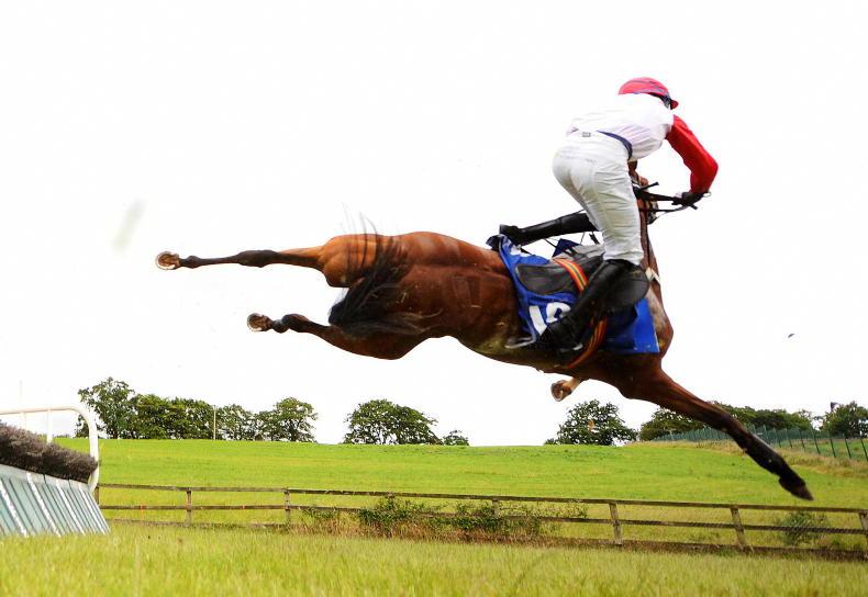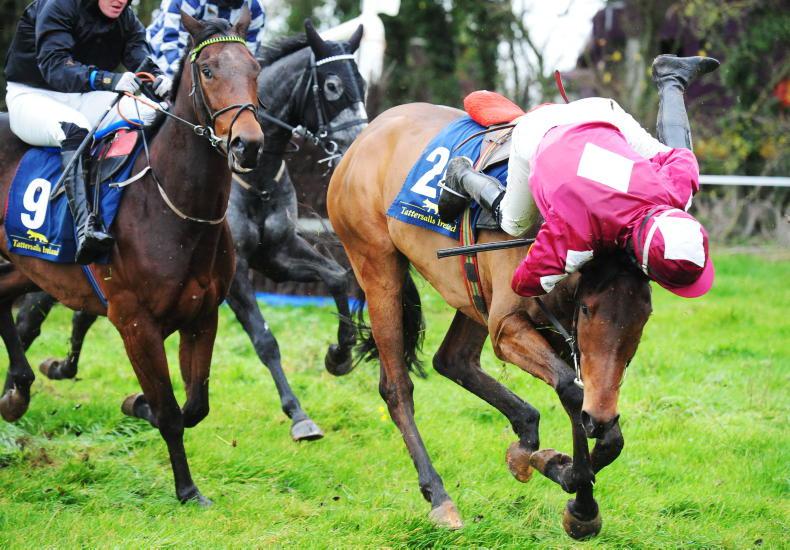 Rocked Up and Richie Deegan (pink) part company at the first fence in spectacular fasion in Ballingarryl \ Healy Racing