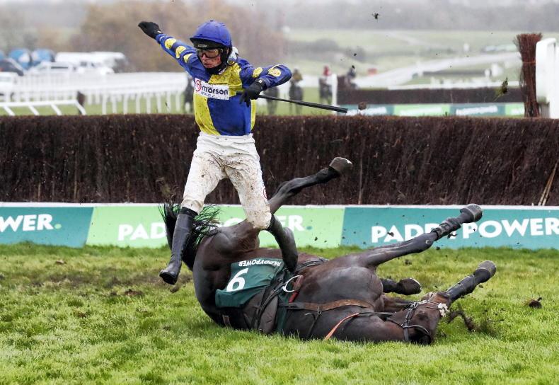Saint Sonnet and Harry Cobden parting company at the last in the Paddy Power Gold Cup Handicap Chase \ Healy Racing