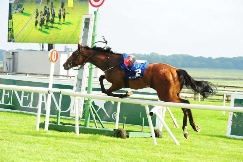 The favourite for the Guinness Handicap Carrytheone jumps the railing back onto the racetrack from the inside after crashing through the rails after the start at the Curragh \ Boy Racing Photo.