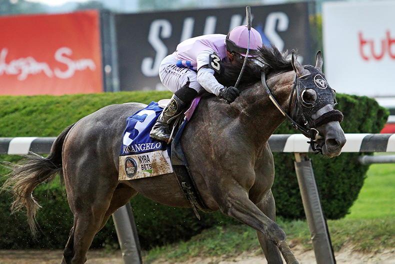 Sent off at nearly 8/1 and the fifth choice behind Forte, Angel Of Empire, Tapit Trice and National Treasure, Arcangelo raced sixth early before inching up toward the leaders on the backstretch.