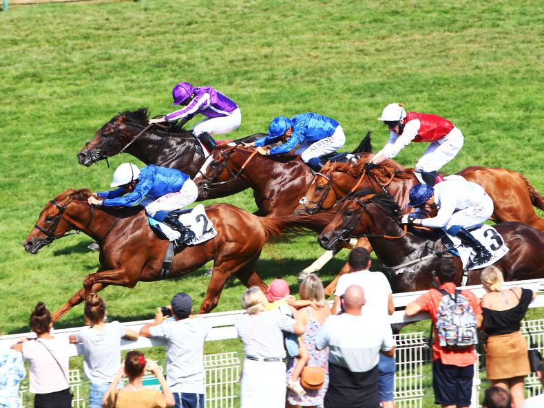 Deauville racegoers watch Space Blues and William Buick win the LARC Prix Maurice de Gheest (Group 1) for Godolphin and Charlie Appleby, from Hello Youmzain (white) and Lope Y Fernadez (purple)/Healy Racing.
