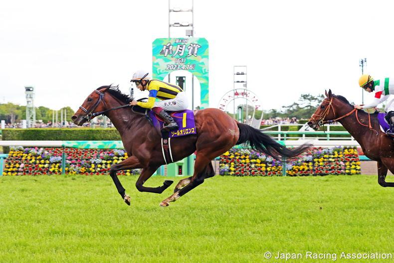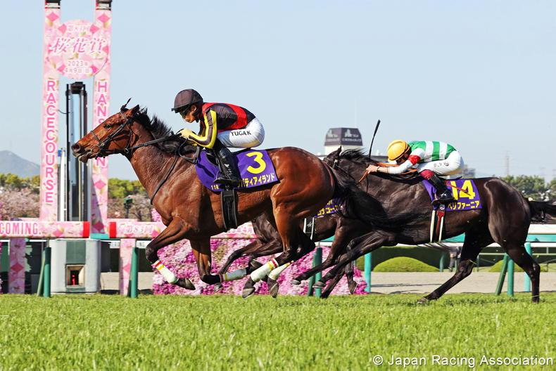 Satsuki Sho winner and odds-on favourite, Sol Oriens, made a late bid to run down Tastiera but was given too much to do in the final furlong.