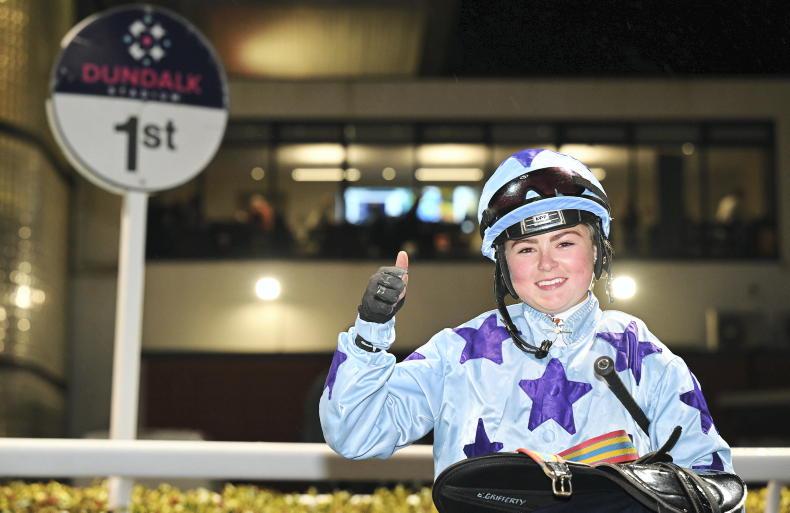 EMILY Grifferty partnered her first winner in the Book Online At DundalkStadium.com Apprentice Handicap as the John McConnell-trained Syosset, the 50/1 outsider of the field, came from off the pace to score on his handicap debut.