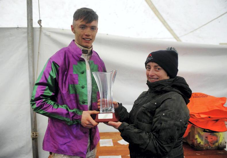 At Bandon in 2029, Michael O'Sullivan recieves the leading jockeys trophy from Catherine O'Donovan after riding a double on the day \ Healy Racing