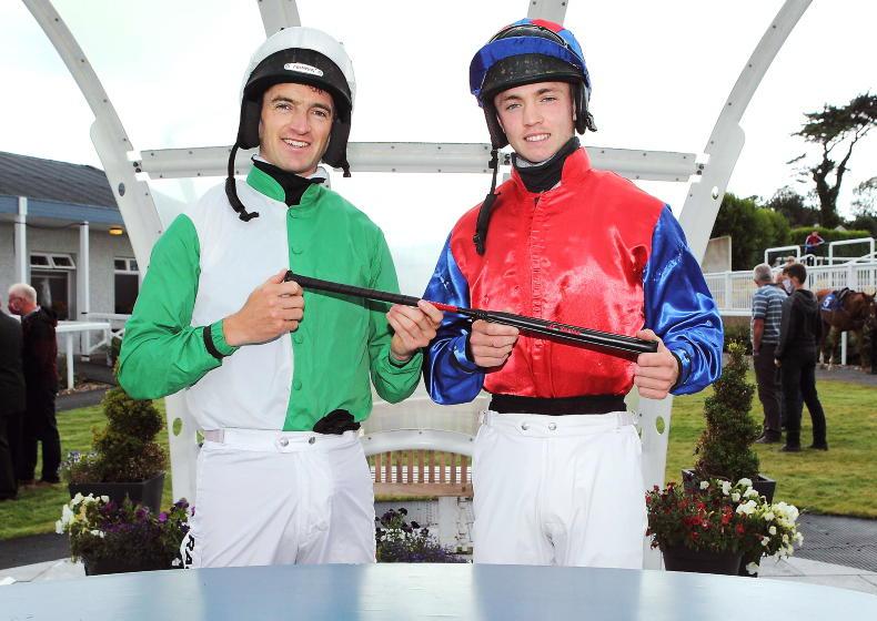 Patrick Mullins presents Michael O’Sullivan with one of his prizes after Michael won the inaugural running of the J.T. McNamara Series \ Healy Racing