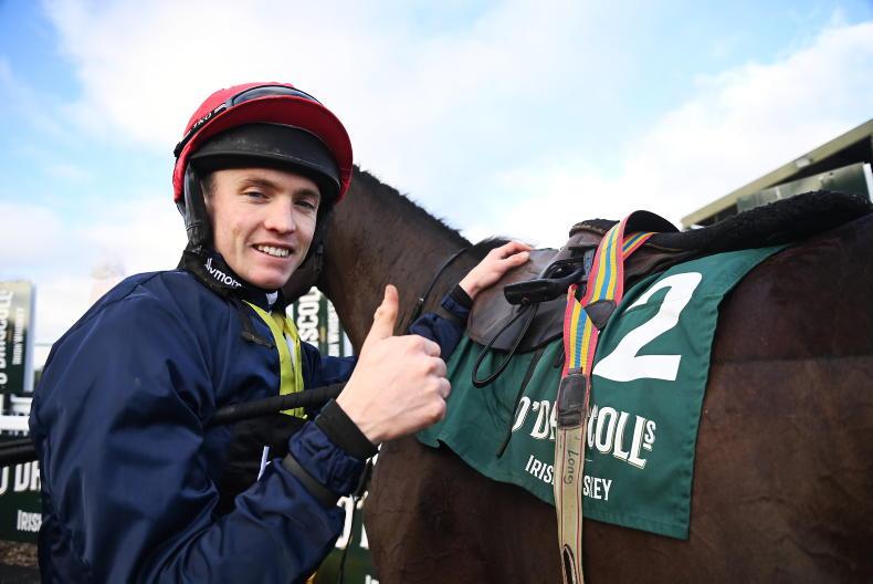 Michael O'Sullivan celebrates aboard Jazzy Matty after his second win on the Cheltenham card in 2023 \ Healy Racing