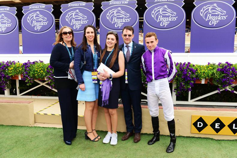 Trainer Aidan O'Brien and his wife AnnMarie and daughters Sarah and Ana O'Brien pictured with jockey Ryan Moore delighted after Ryan won partnered with Mendelssohn