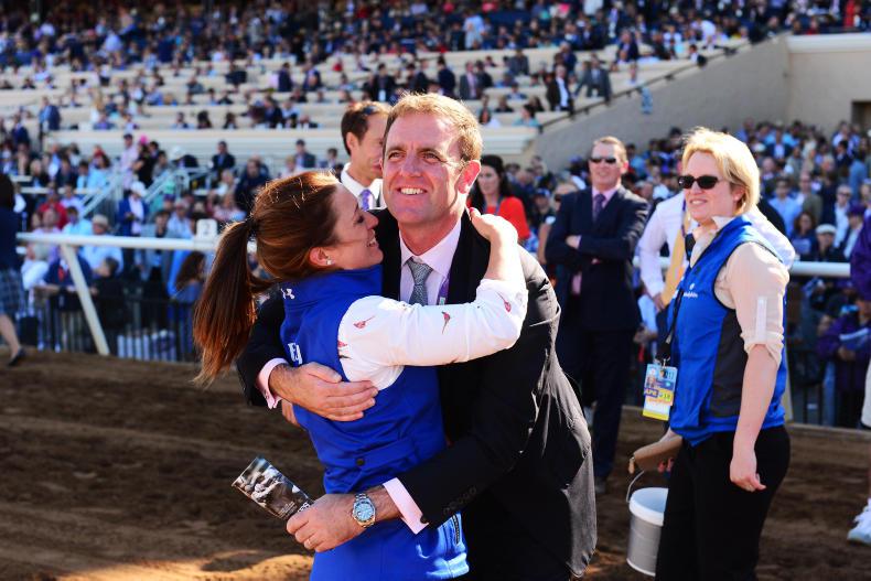 Charlie Appleby gives groom Kirsty Milczarek a hug as the celebrate after their win at Del Mar