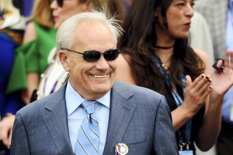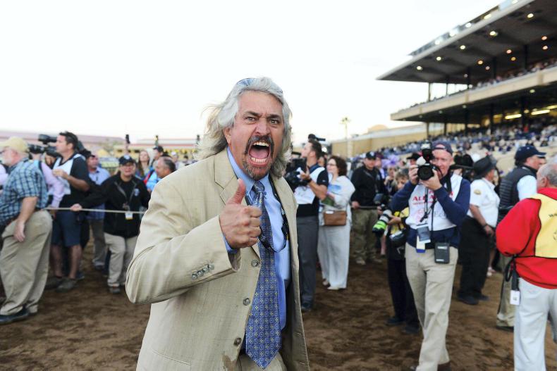 A delighted trainer Steve Asmussen celebrates after Gun Runner and Florent Geroux won