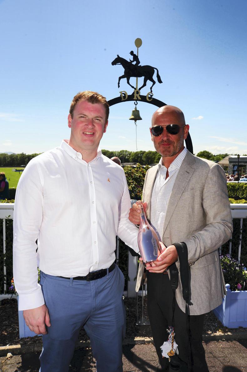 Owner, Philip Reynolds (right) accepts his trophy from Paul Hanna after William B won at Downpatrick (Photo: healyracing.ie)