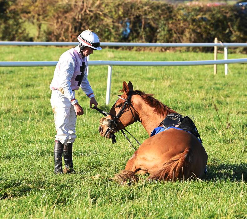 "Give me a minute" - jockey Carl Millar waits for his mount Swift Sonnet to catch her breath after parting company at the 10th fence at Umma House \ Healy Racing
