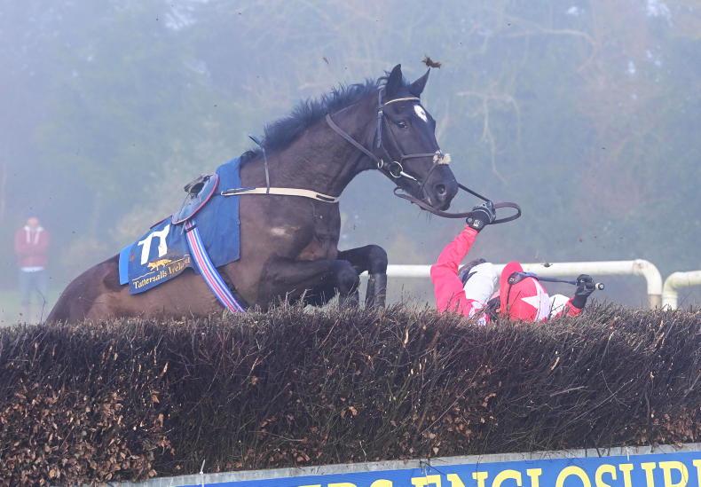 Oldtown in February - Deravarra Rose and Barry O'Neill part company at the last in the mares' maiden. Both were okay after their fall \ Healy Racing