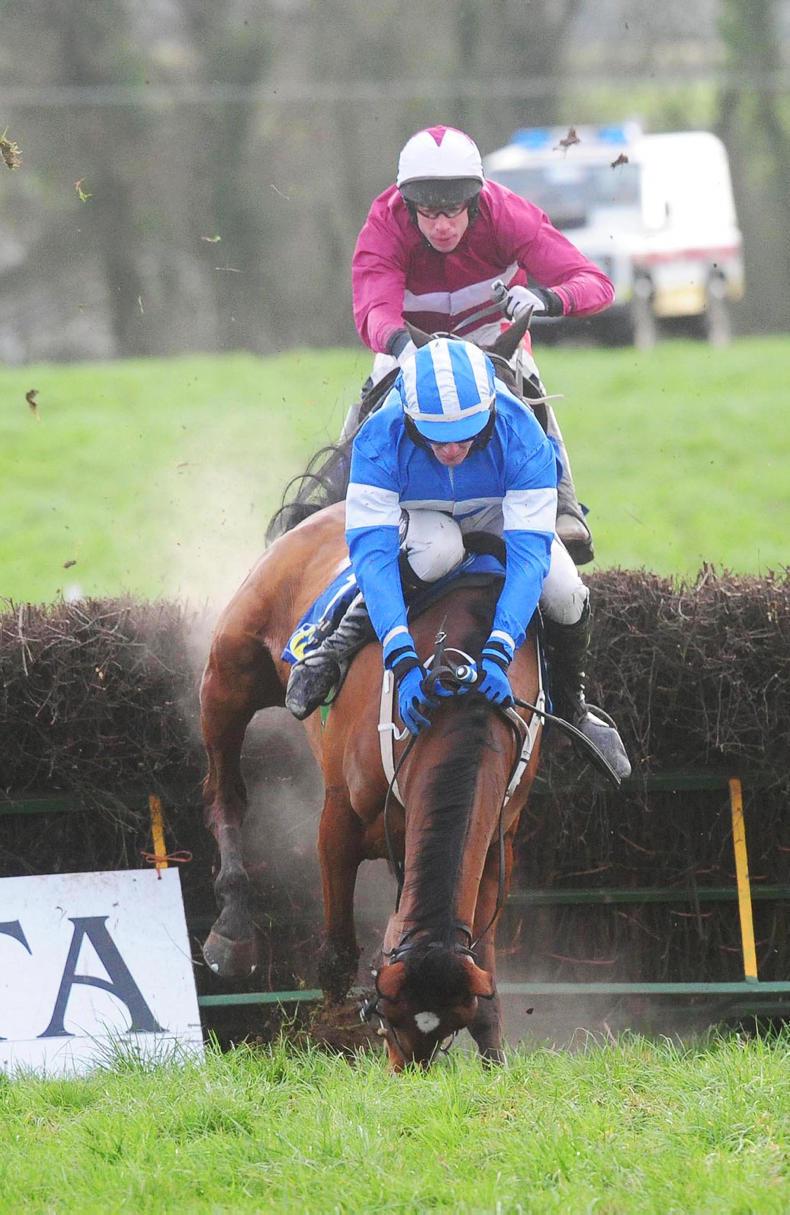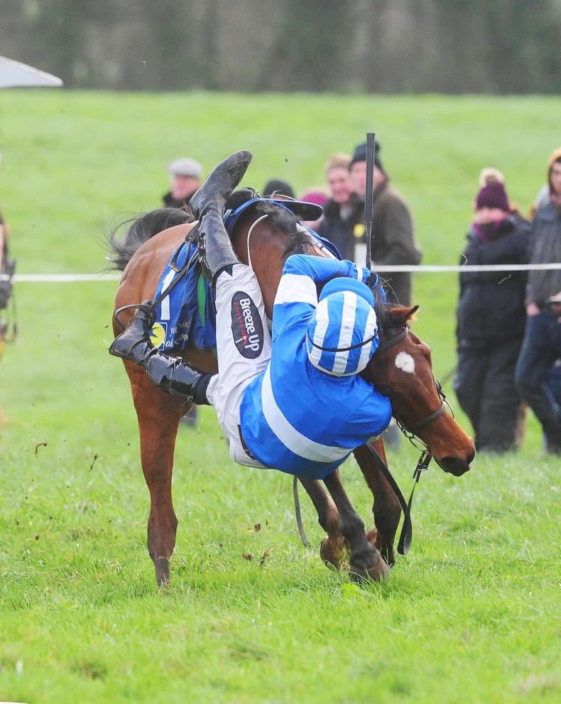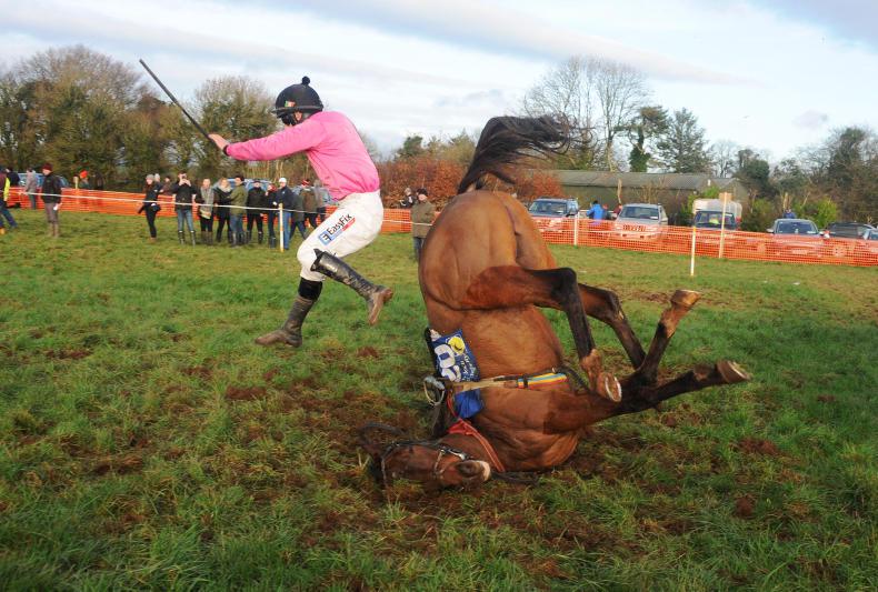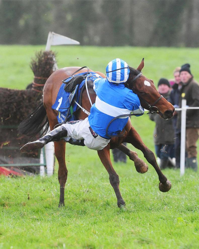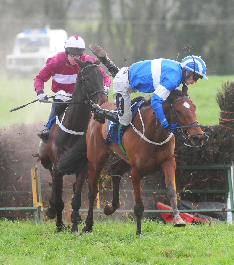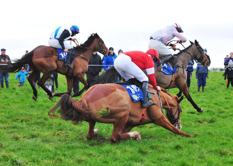 Shallow Run and Luke Murphy (near side) part company at the last fence leaving Nell's Well and Eoin O'Brien (centre) to win the five-year-old mares maiden. Photo Healy Racing