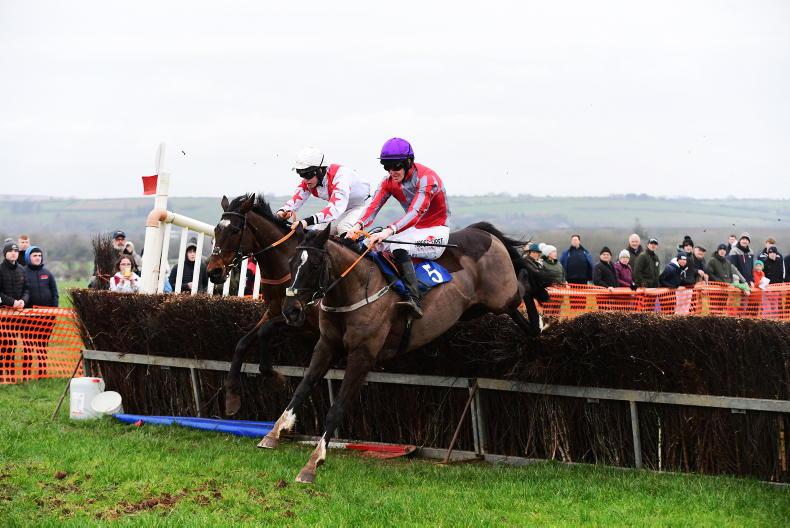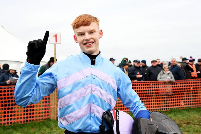 First-time Carrigarostig visitor Charlie Mullins, who was posting a second points victory, reported of his mother Helen’s Ontheropes: “My uncle Willie Mullins gave him to me five months ago and said that I could have him for hunter chasing. I was a bit worried about fitness coming here and we will try and win another open with him now.”