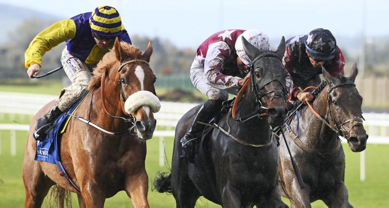 A tilt at the last major prize of the season could beckon for Joupe (25/1) who came out the right side of a great finish to the one-and-three-quarter-mile handicap. Owned and trained by Wicklow-based restricted licence holder Peter Lawlor, this Lope De Vega filly notched up the first of her four victories over seven furlongs 11 months ago. She has steadily climbed in trip and in the ratings since then and reserved her best effort yet for her first try at this distance.