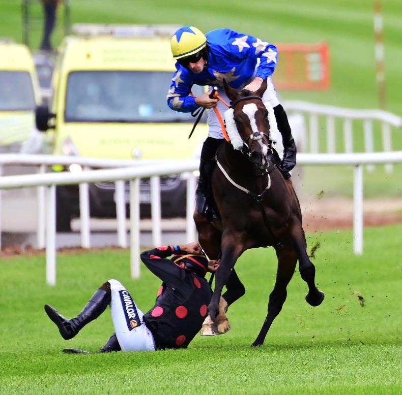 Pepsiwithacap and Sean FLanagan do well to avoid fallen jockey Conor Orr at the first flight in the Hovis 3-Y-O Hurdle at Down Royal, all were ok after their fall \ Healy Racing