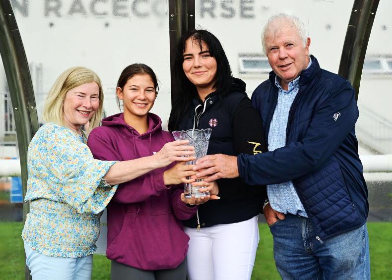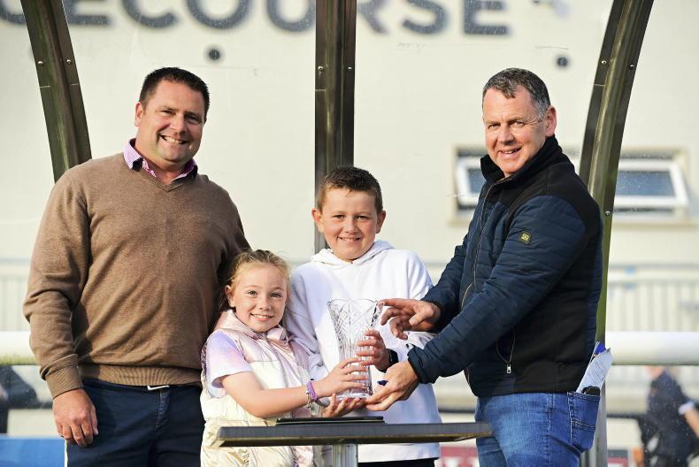Disco Boots won for trainer Peter Fahey in Roscommon, with kids Lauren and Conor and Shane Fleming presenting (right) \ Healy Racing