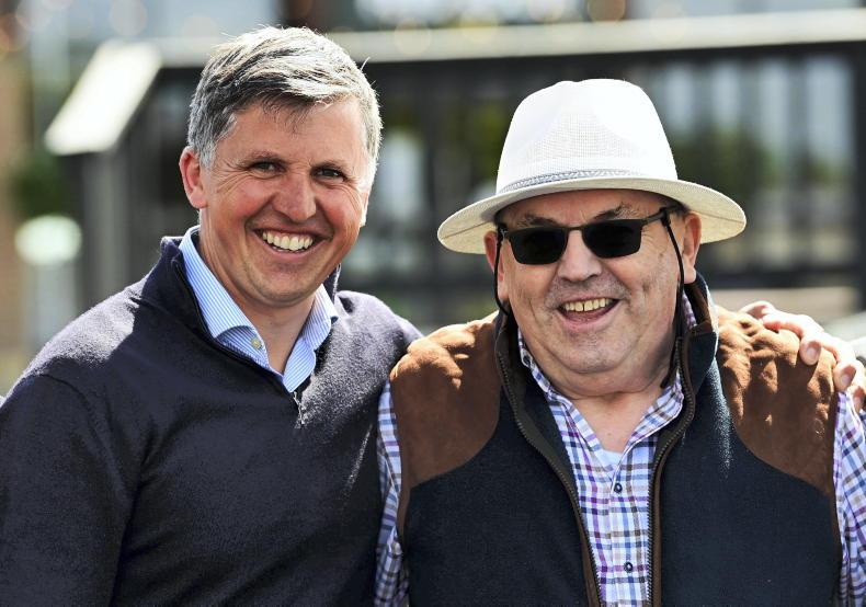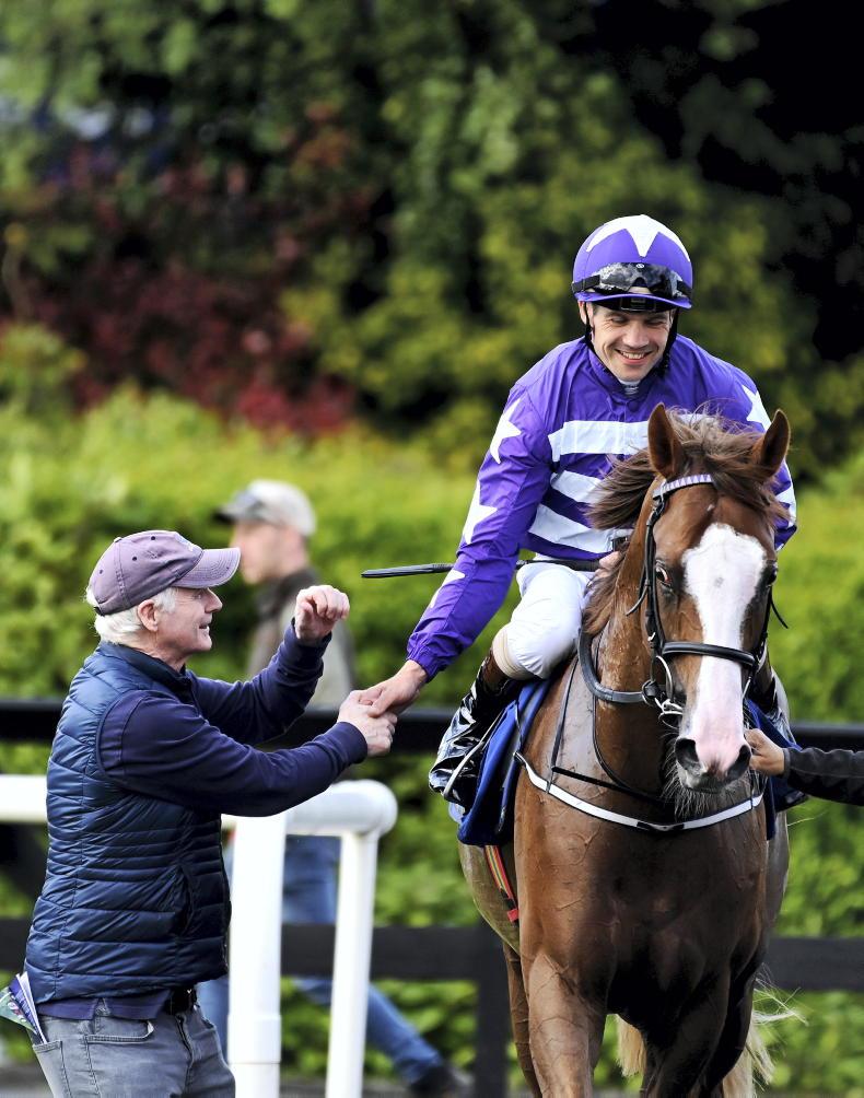 Fairyhouse winner Kortez Bay and Robbie Colgan are greeted by winning owner John Lavery \ Healy Racing