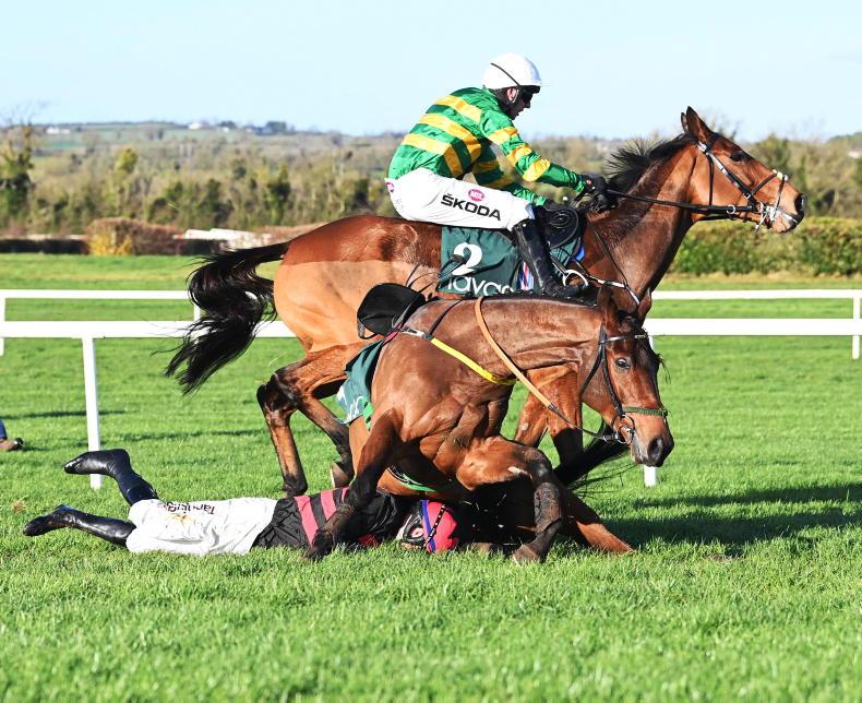 Affordale Fury and Bryan Cooper part company at the last when holding every chance in the John Lynch Carpets and Flooring Monksfield Novice Hurdle at Navan. Thankfully both were okay afterwards \ Healy Racing