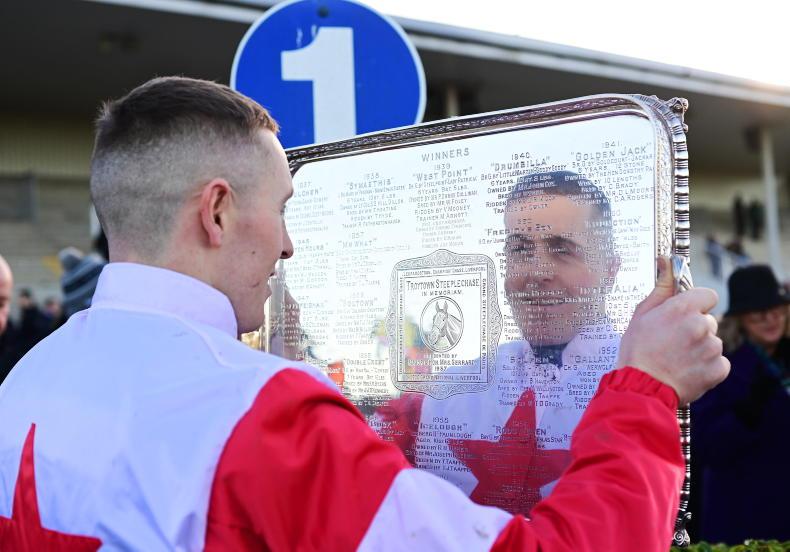The Big Dog's winning jockey Keith Donoghue admires his trophy after his Troytown success \ Healy Racing