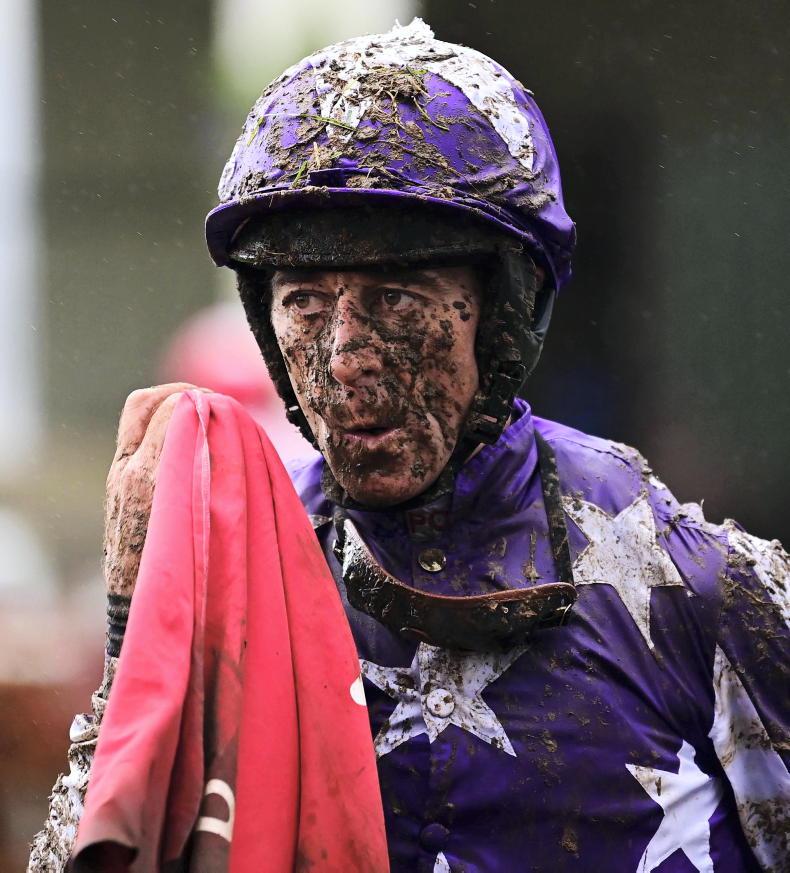 Davy Russell wipes away the mud after riding Gevrey in the Gowran Park Handicap Chase \ Healy Racng