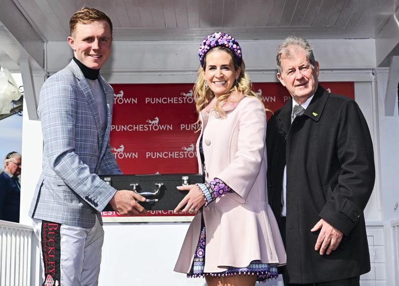Kieren Buckey recieves his prize after winning the Adare Manor Opportunity Series 2022/23 from Sue Ann Foley and JP McManus \ Healy Racing