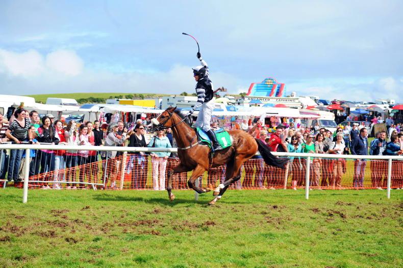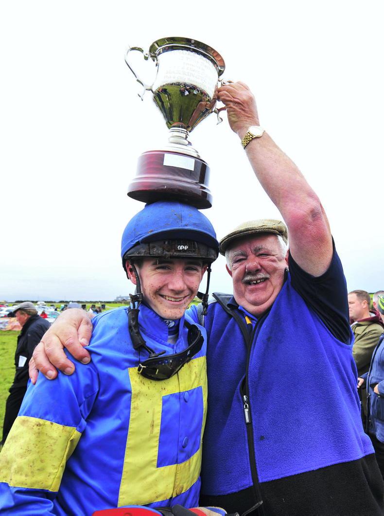 Dingle 2015 and 12-year-old Dylan Brown McMonagle is held aloft by Gerry Boyle after winning the Dingle Derby on Let's Go \ Healy Racing