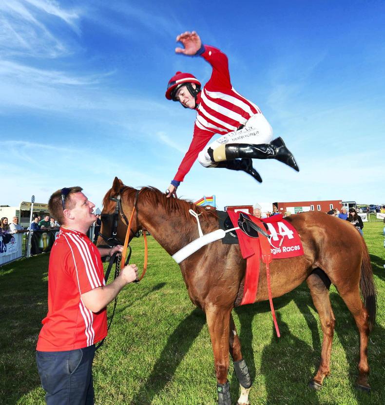Happy jockey Joey Sheridan does a flying dismount after winning the Dingle Skellig Plate in 2018 on Dan's Your Man \ Healy Racing