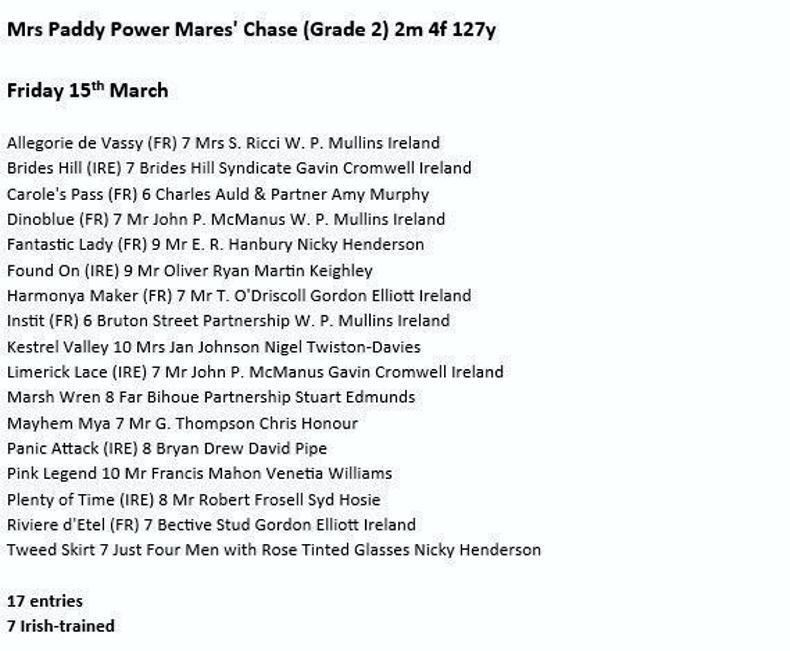 Dinoblue heads the entries for the Mrs Paddy Power Mares' Chase at Cheltenham on Friday, March 15th.