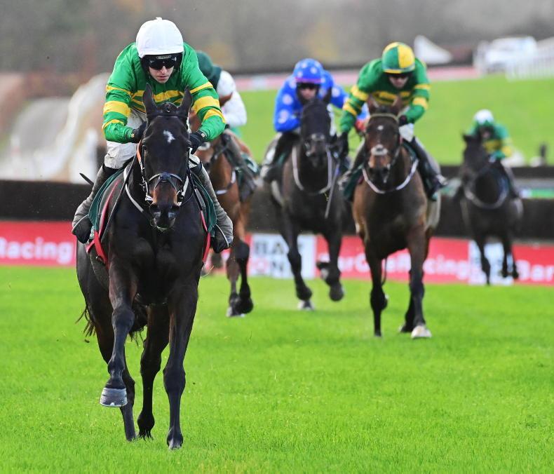 Down Memory Lane draws clear of the field at Navan, but the same owner's Birdie Or Bust (yellow and green cap) remains a bright prospect \ Healy Racing