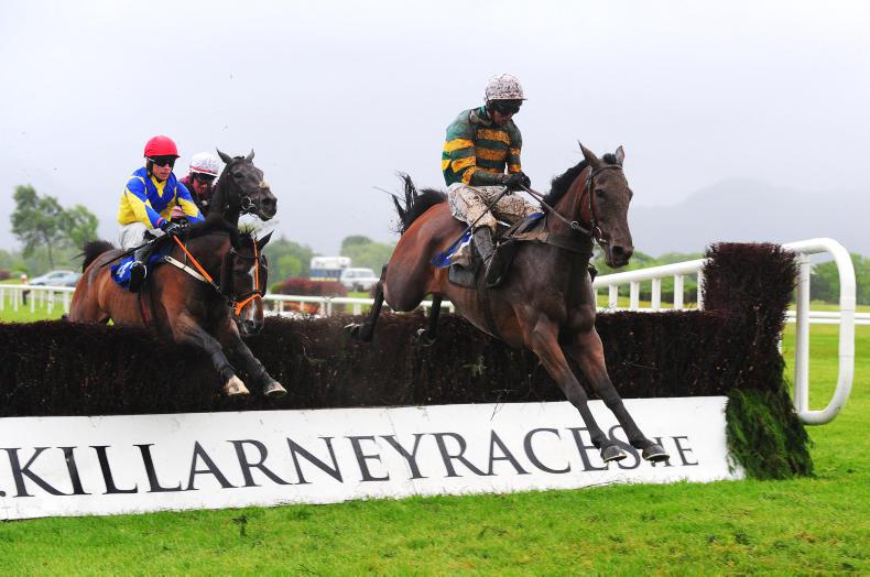 Auvergnat and Mark Walsh (right) over the last fence in the Kerry National