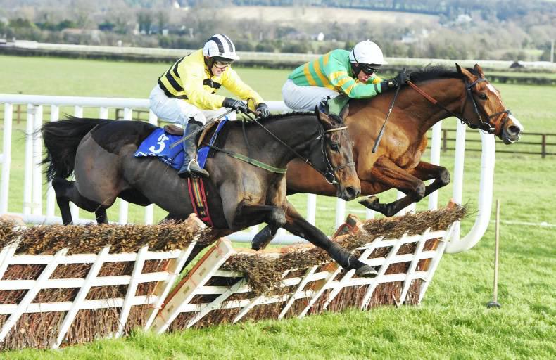 Kitten Rock (far side) and Mark Walsh jump the last better than Glens Melody before going on to win the Grade 3 Limestone Lad Hurdle. HEALY RACING PHOTO