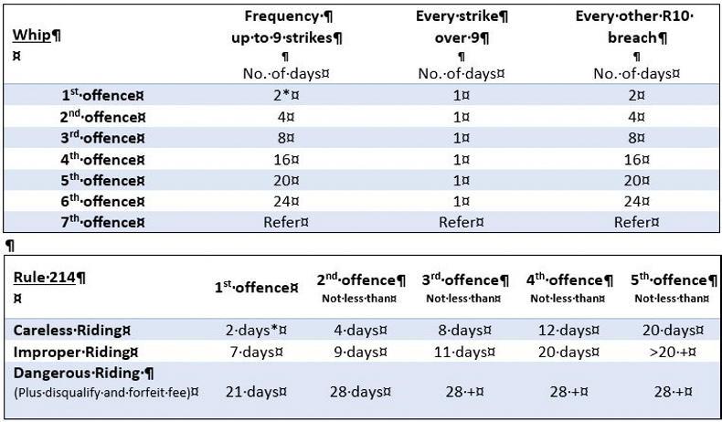 Again, to allow for a period of adjustment, the raceday stewards may show some discretion to a rider on his first offence for what they deem a minor breach of the whip rule, but this rider will incur at least a four-day suspension for any subsequent breach of the whip rules within the next nine months.