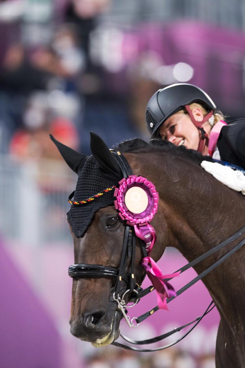 Jessica von Bredow-Werndl shows some love to her double Olympic gold medal winner TSF Dalera \ FEI/Christophe Taniére