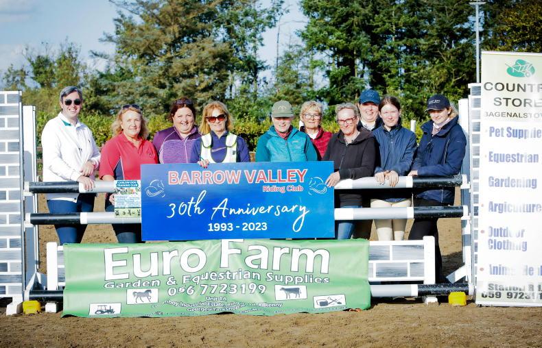 Judge Rory O'Sullivan-Hennessy, Louise O'Neill, Caroline Gould, Sally Roberts, Susan Patterson, Valerie Crean, Ann Murray, Isobelle Gould, Grace Cantlon and Catriona Doran, all smiles after running the Barrow Valley RC leg of the AIRC South East Show Jumping league in their 30th anniversary year.
