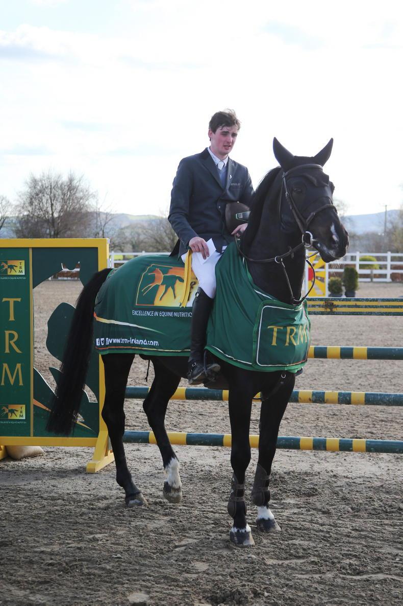 Brendan Murphy with Gabriel Mullins and Alan Robertson's Zambia, winners of the TRM Showjumpers Club Spring Tour Romanov Grand Prix, sponsored by Ballywalters Farm, at Barnadown \ Alex Perry Jumpinaction.net