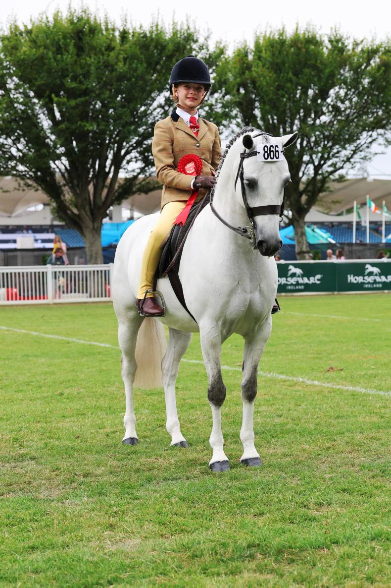 Co Tyrone’s Casey-Lee Millar won the 133cm qualifier, and the day’s show hunter pony championship, with her mother Eileen’s eight-year-old Irish Sport Pony gelding Out Of The West (Lehid Canal Prince - Farranderry Lucy Liu, by Desarbe Falcon). The grey, on whom Casey-Lee won her 133cm class at Dublin last August, was bred in Co Tipperary by Katie and Malachy Hehir.