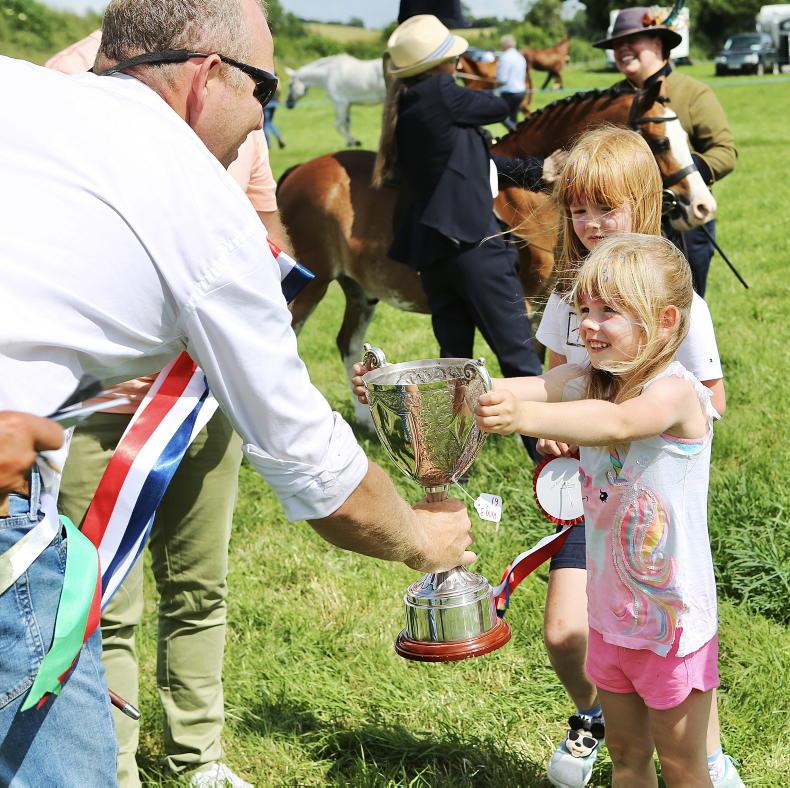 "For you" Annabelle and Lili Mae Flanagan present the Flanagan & Co Cup to Bryan O'Halloran after Cabra Jane won the Connemara supreme championship at Athlone Show \ Susan Finnerty