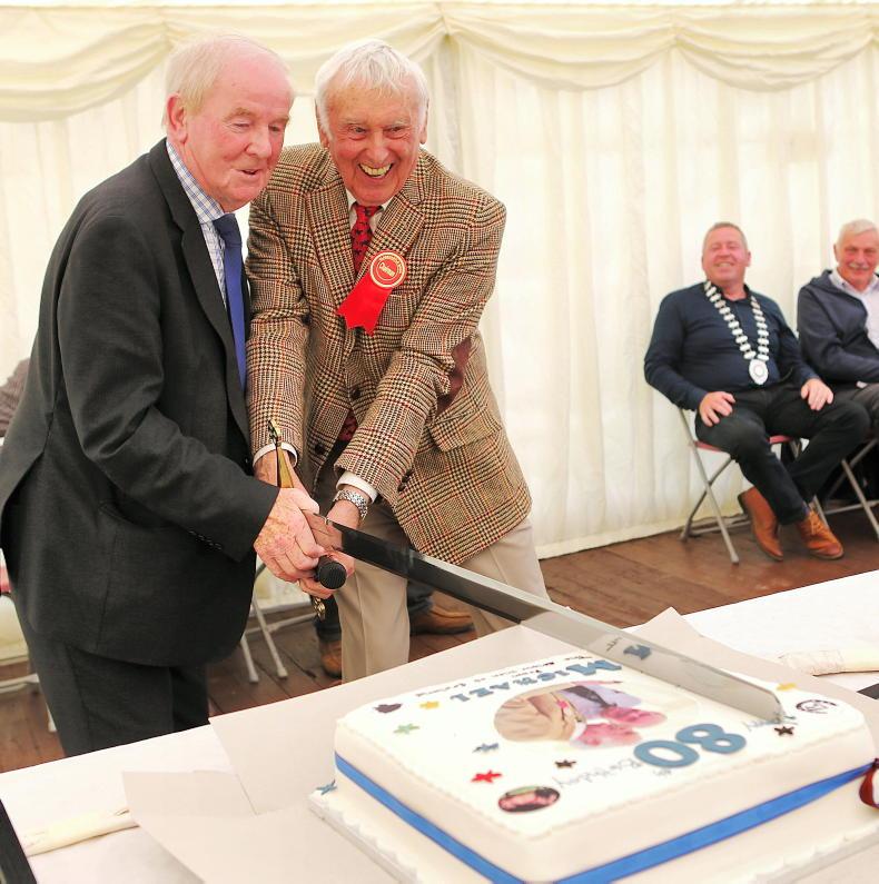 Birthday Wishes: Former ISA all-rounder Michael Hughes and Clarecastle Show chairman Michael Slattery cut the surprise birthday cake presented to Hughes at Clarecastle \ Susan Finnerty