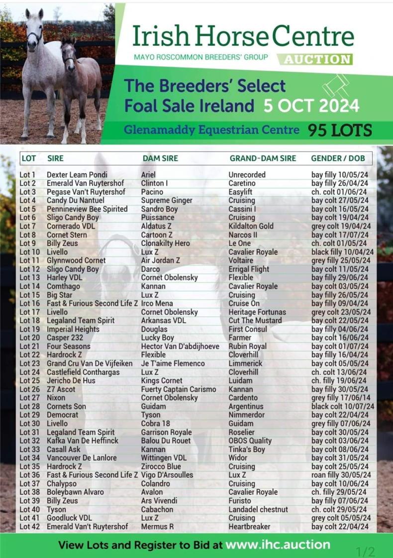 THE Irish Horse Centre (IHC), powered by the Mayo Roscommon Breeders’ Group (MRBG), will host Edition 7 of The Breeders’ Select Foal Sale Ireland, which is now a well-established flagship foal sale, run by the group for the first time in 2018.