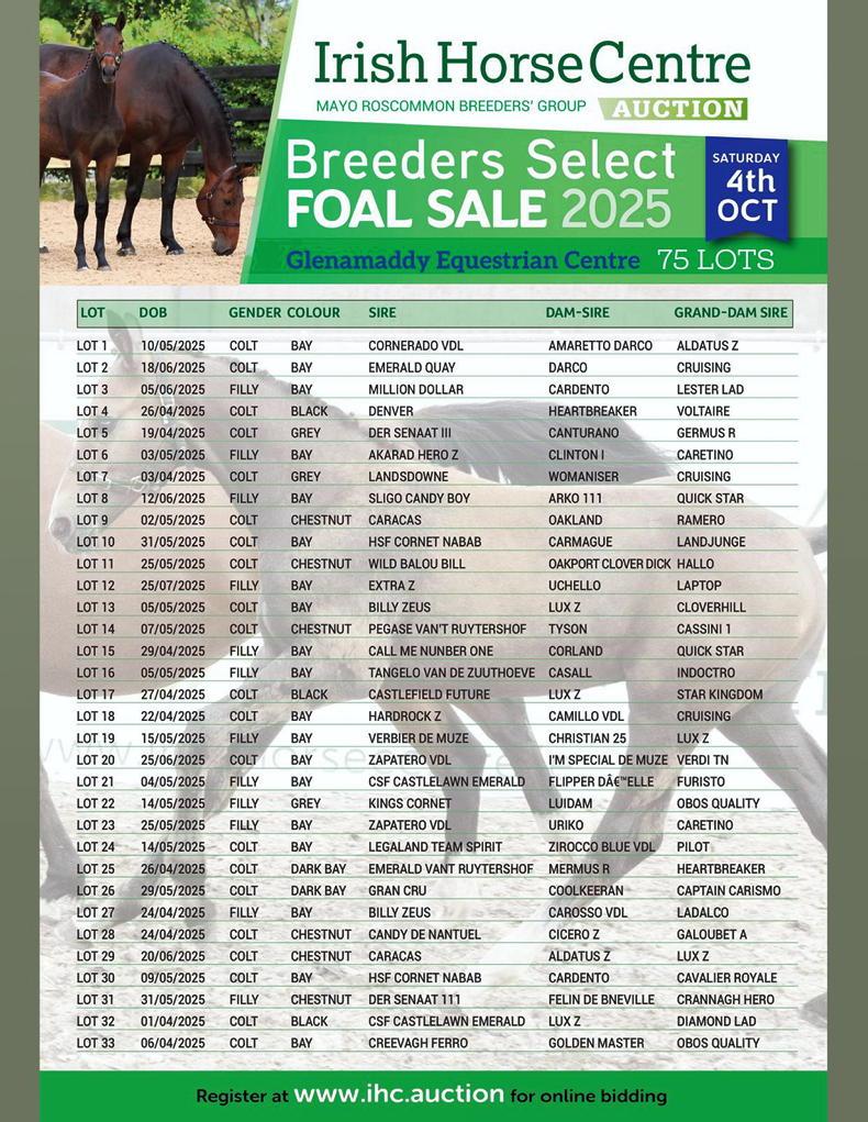 THE Irish Horse Centre (IHC) powered by the Mayo Roscommon Breeders’ Group (MRBG) is proud to present Edition 8 of The Breeders’ Select Foal Sale Ireland - now a well-established flagship foal sale run by the group for the first time in 2018 - on October 4th next.